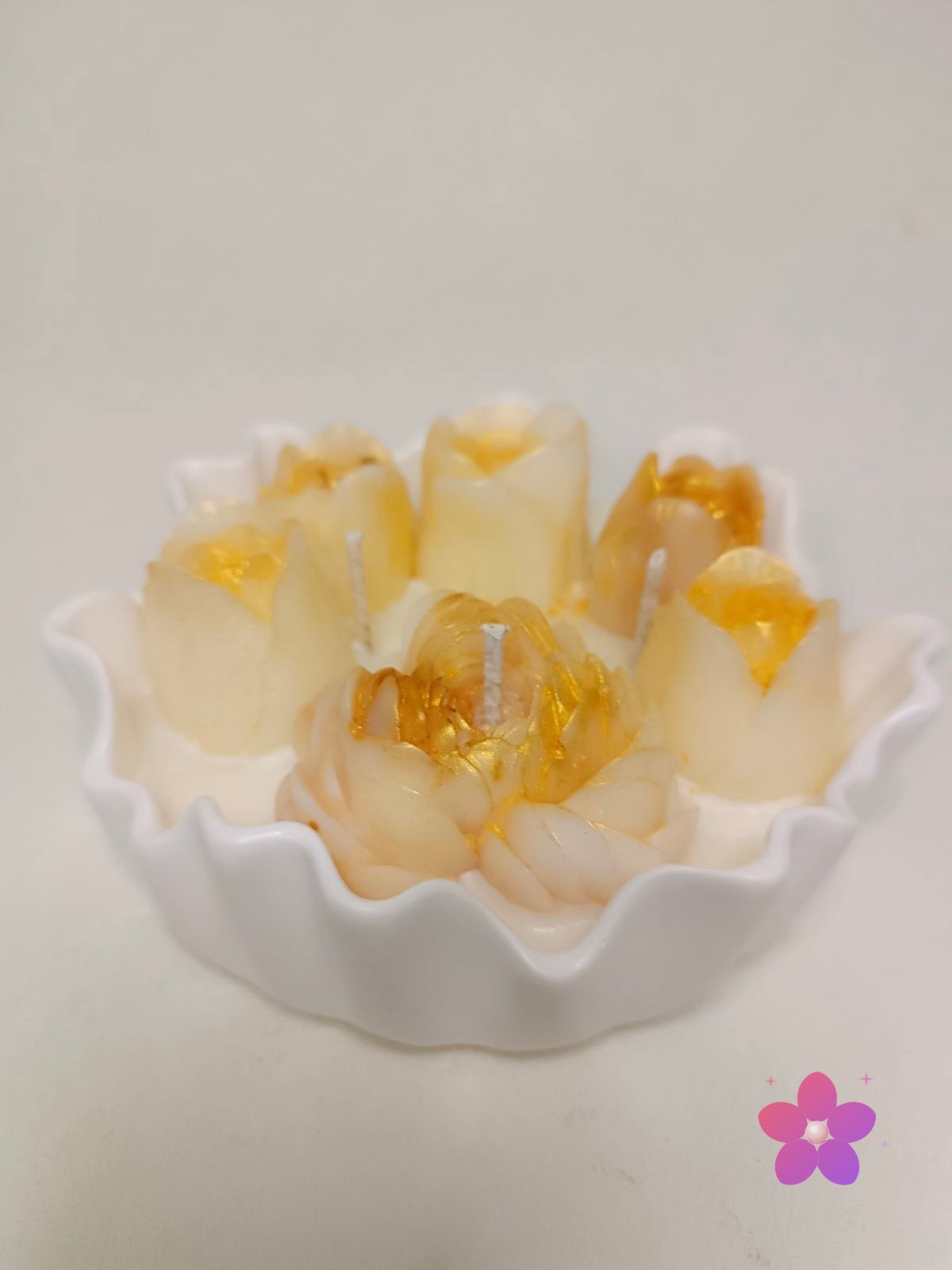 Ръчно изляти лалета в керамична купа от соев восък с парфюмен аромат. Реалистична цветна композиция, която гори чисто и равномерно — стилно допълнение към домашния интериор. Размери: В5/Ш13